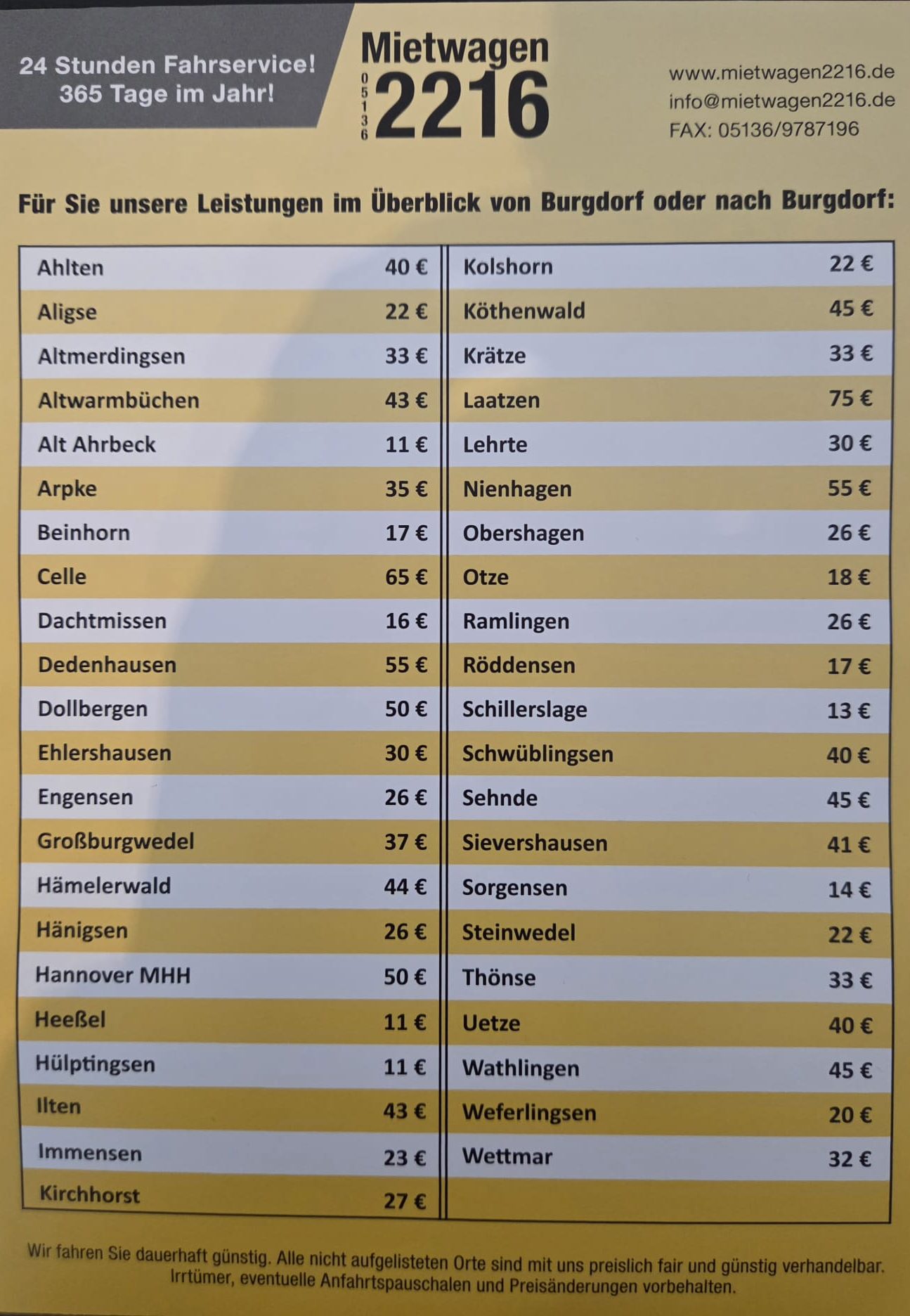 Wir fahren Sie dauerhalf günstig. Alle nicht aufgelisteten Orte sind mit uns preislich fair und günstig verhandelbar.